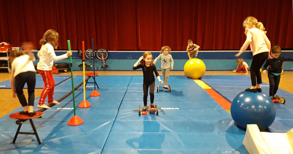 2. Equilibre sur matériel, parcours d’équilibre avec boule, pédalettes, planche à rouleau et barre d’équilibre